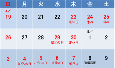 ゴールデンウイーク中は下記の通りに営業します。